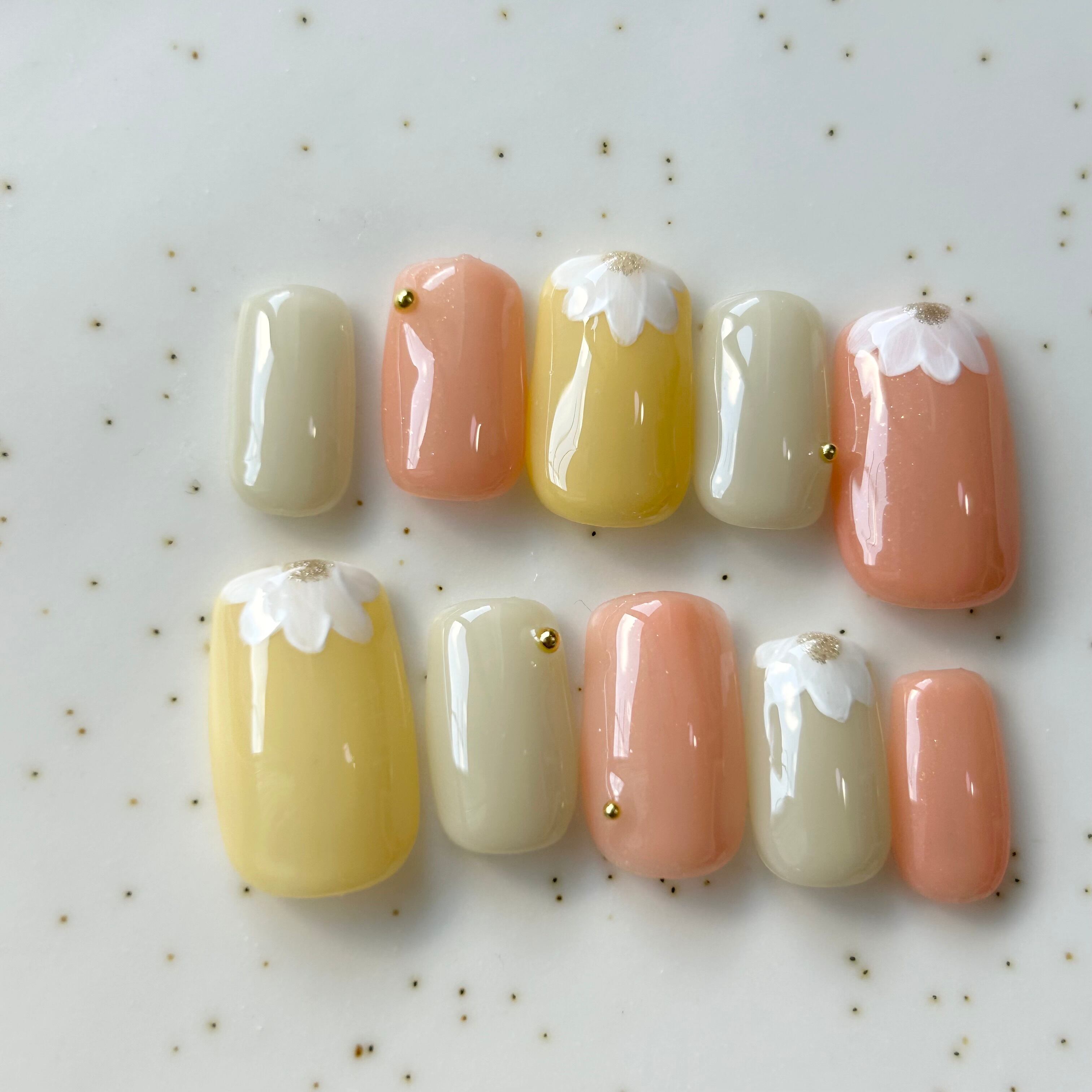 相性の良い◎3色合わせ、先端にマーガレットを描きました✿オレンジはほんのりラメ入り。