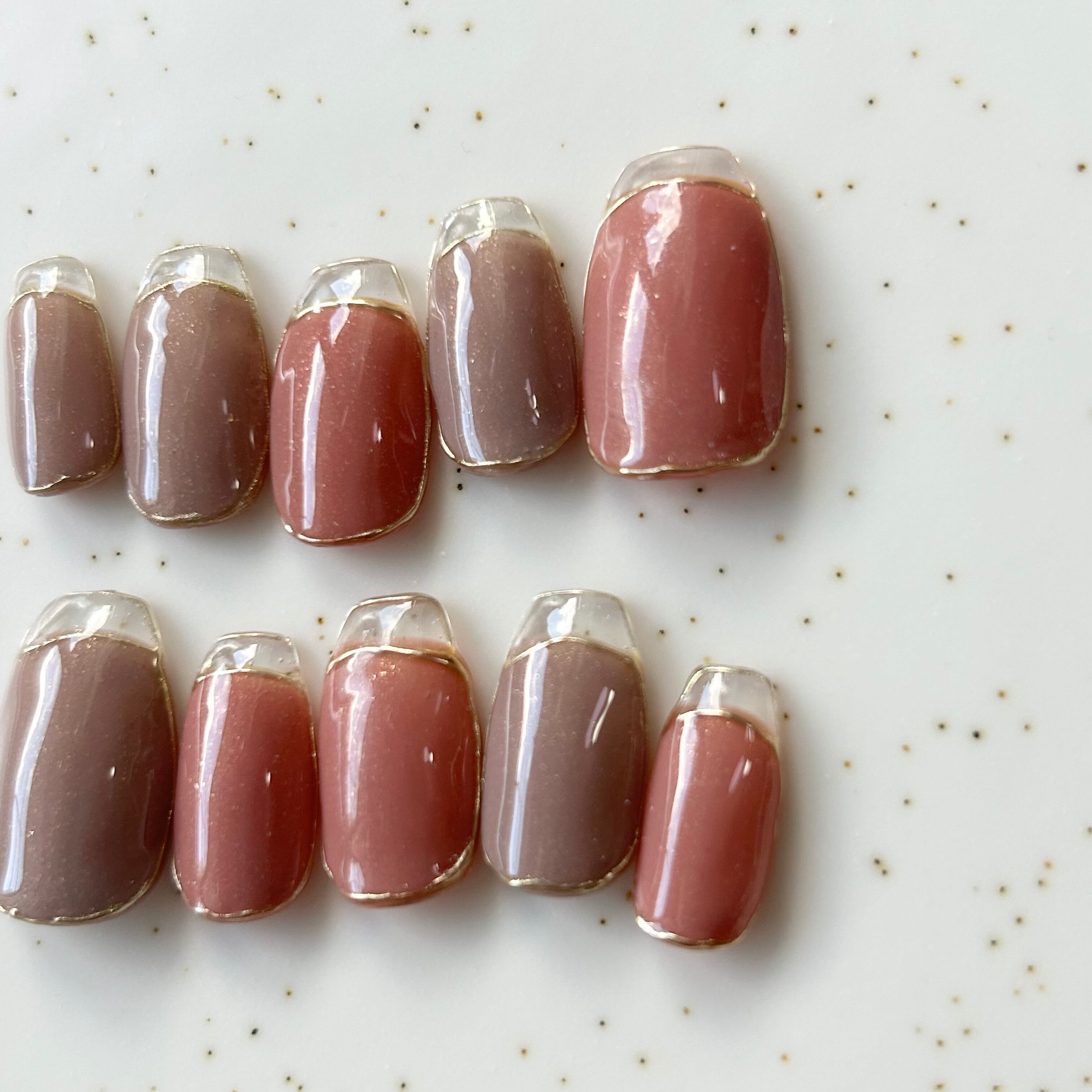 先端がクリアのデザインとなってるので、自爪よりチップの長さが2.5mmくらい長い方がいいです。