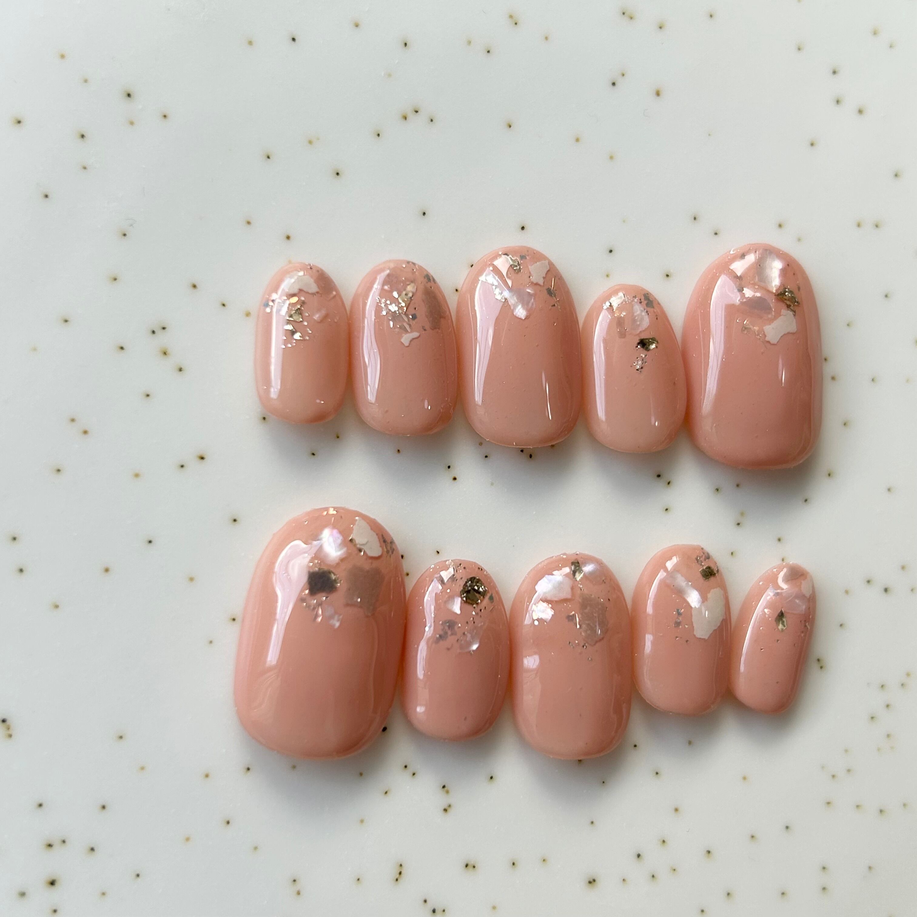 先端にフレーク、金箔、シェルを散りばめたデザインです^_^