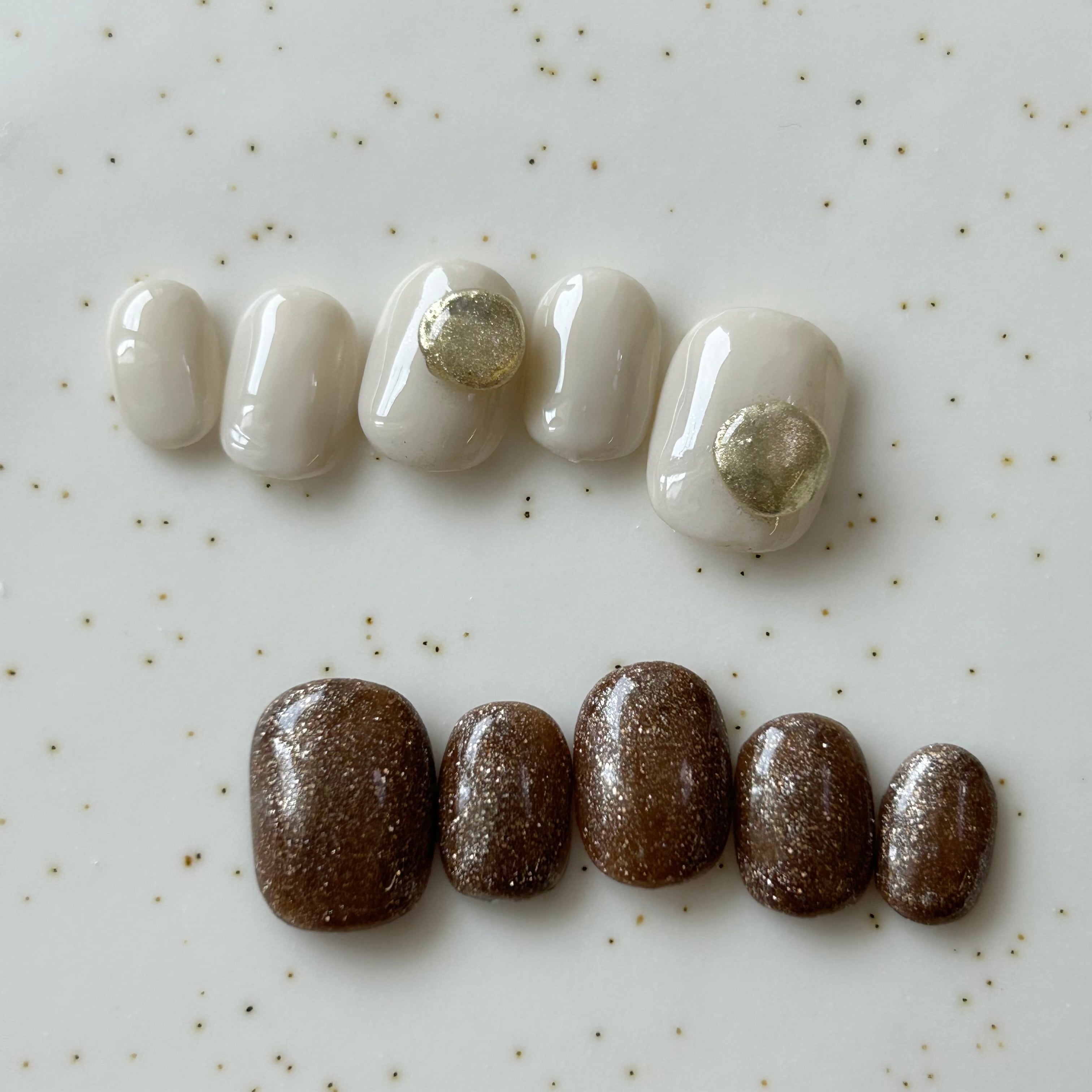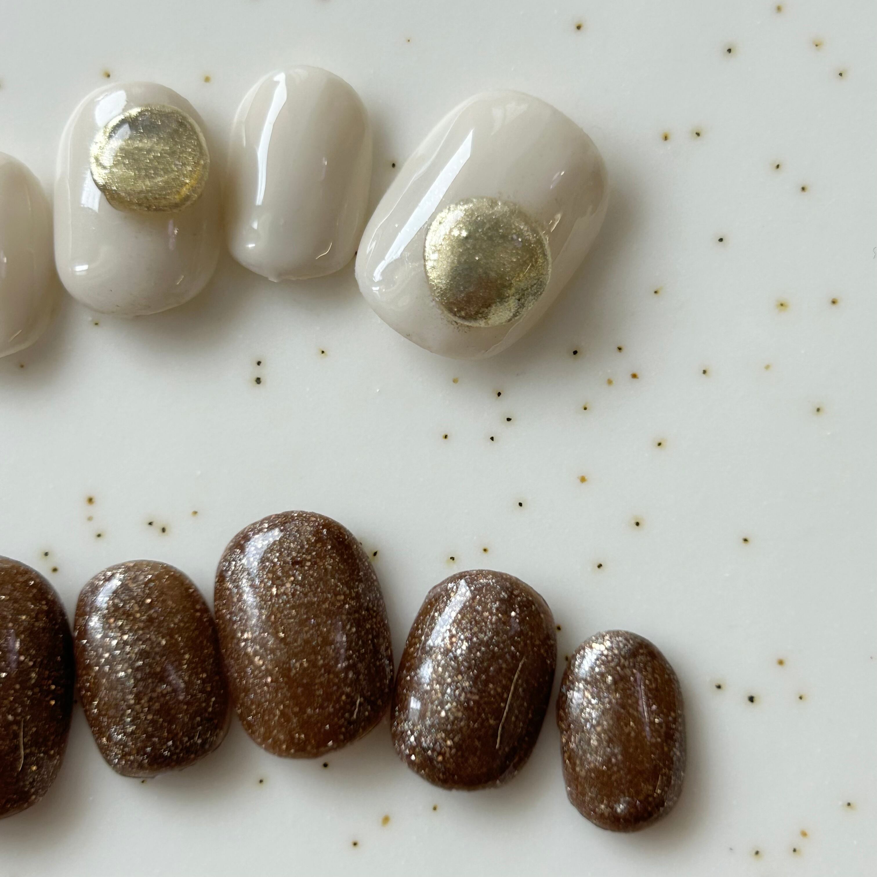 point : 濃いブラウンラメに挑戦しやすいシンプルニュアンスのアイボリーデザインワンポイントにゴールドパーツ
